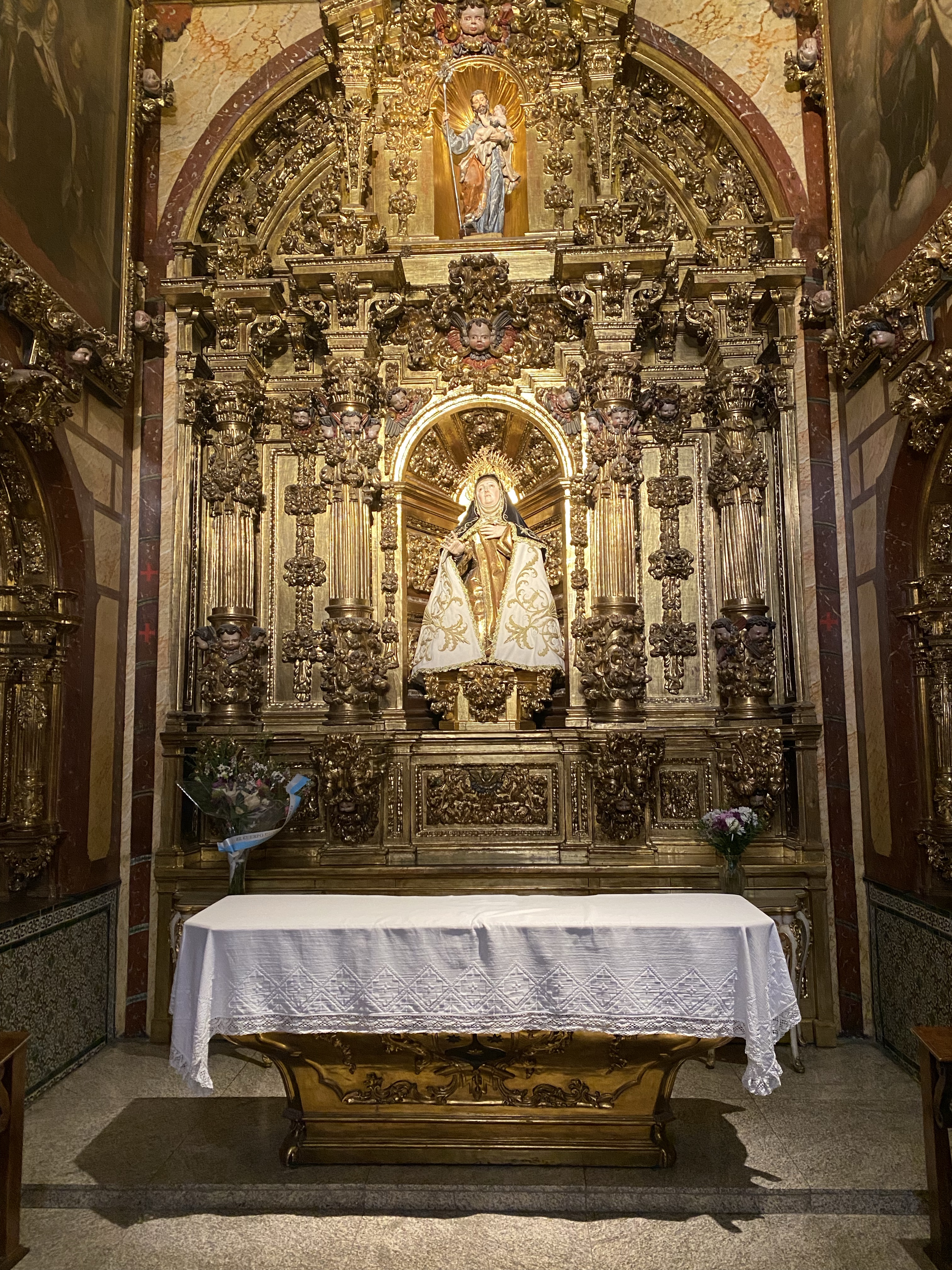 The Church is splendid inside and houses the room where the saint was born, a glittering small chapel dedicated to her, and alongside the church a room full of books she wrote, about her, depictions of all the convents she founded and some interesting relics and objects she used : her walking stick in later life, heavy rosary beads, her ring finger preserved.