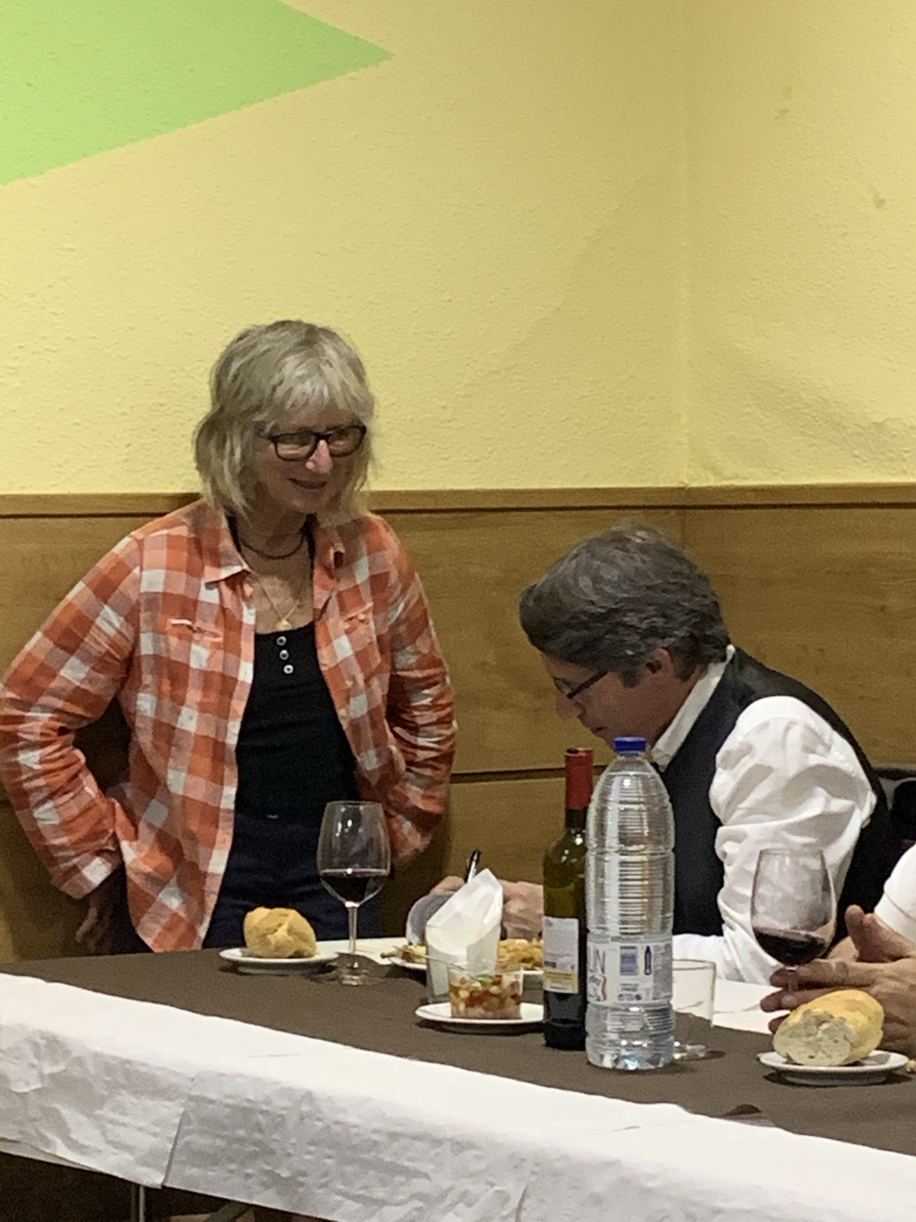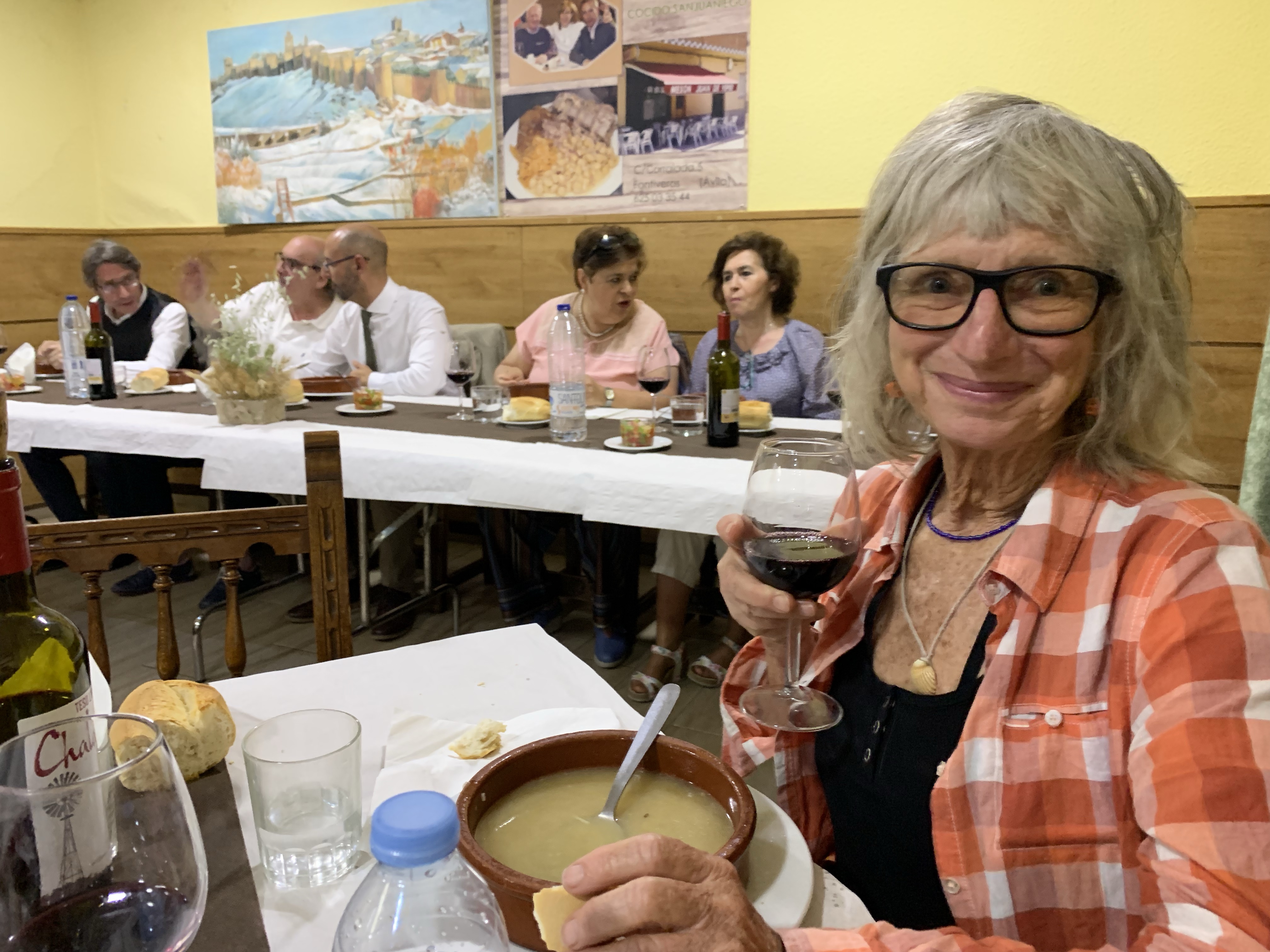 Then we were invited to lunch at the bar named after Juan’s father. Served a traditional Fontiveros meal I was told: Soup a la St Juan (a chicken noodle broth), followed by chunky meat and chic peas. I ate the chic peas. The sweets were the best but wisely I only ate half as very very rich. I needed my brain to be working so regretfully had only a couple of glasses of the good tasting red wine. I took my poetry collection to the poet to sign.