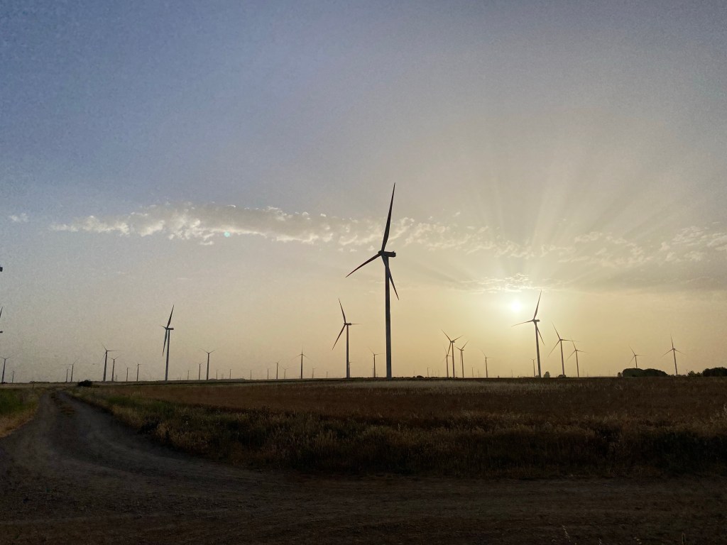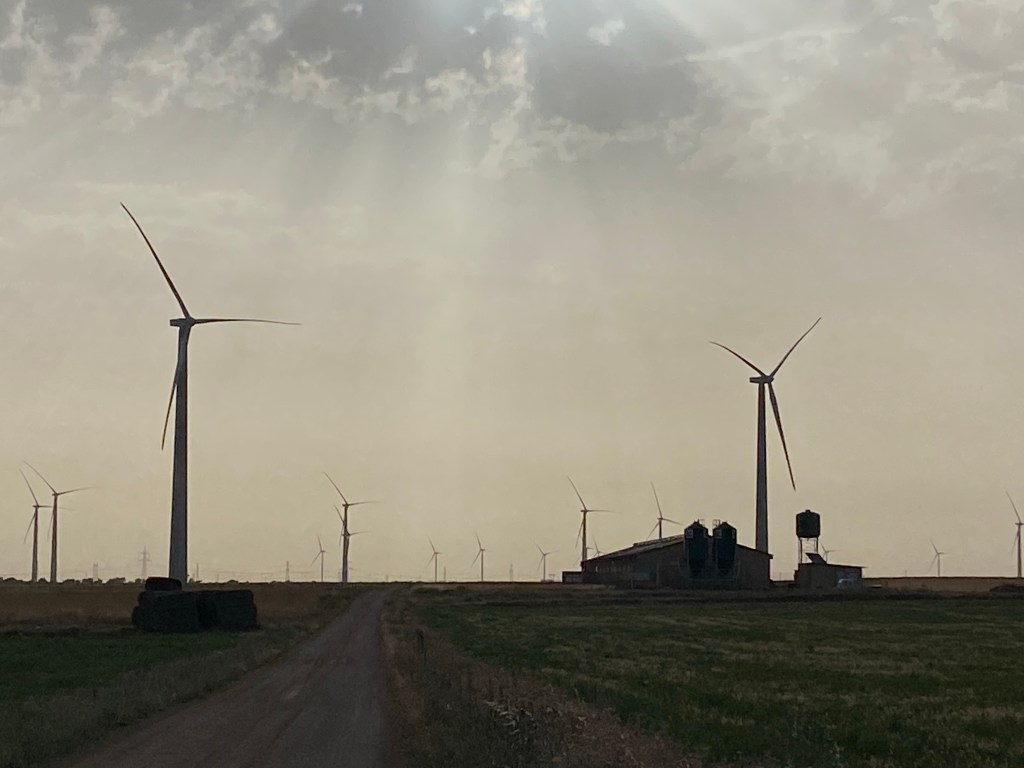 I am walking in a wind turbine forest today. Tall, silent, looming presences stand sentinel along the meseta for the best part of 5 km. In the dark predawn landscape the white turbines assume a shimmering beauty as the sun rises behind them. It seems that they reach up forever into the sky, rather like a space version of Jack’s beanstalk.