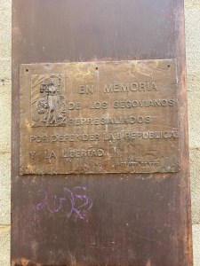 After a while I turn back up the steps to the Church of San Martin and on the wall, hidden in the shadows, is a plaque to those Segovia resistance fighters who died fighting the Franco Nationalists: 3,000 Segovian men (31 May to I June 1937). A lot of men .