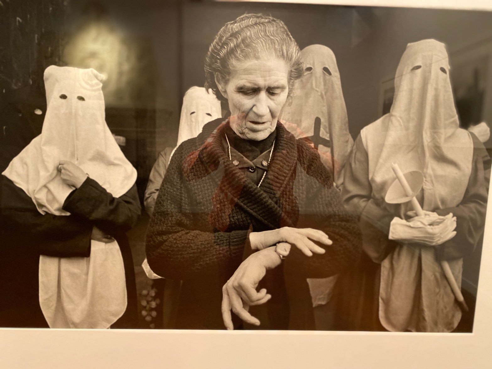 Cristina’s photos of that time tell of poverty and humour, of anger and religious intensity, and of cruelty. Many of the photos are of the Semana Santa rituals in the villages especially of Northern Spain.There are penitents on bloody knees in the mud or on hard stones, bare feet bleeding, old women standing stoney faced as they look towards the image of Jesus on his cross, villagers in processions klu-klux clan-like walking with the stark landscape in the background, carrying the Madonna or the crucified Christ. And these statues are heavy.