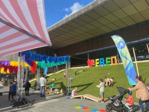 I walk across the Square past the face painting and the children rolling down the lawn and the Lego blocks half assembled .( Wheres the live music ? ) to the FOMO building and the sculpture of the 3 women, one of whom is holding a baby.