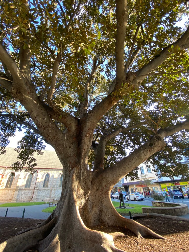 St John’s Church(1943), a glimpse of the Town Hall ( 1887) and the new Dept of Communities/ FOMO building( 2021/2022) combine to offer an interesting and colourful backdrop of the historical and the contemporary.The Fig tree grows solidly alongside.