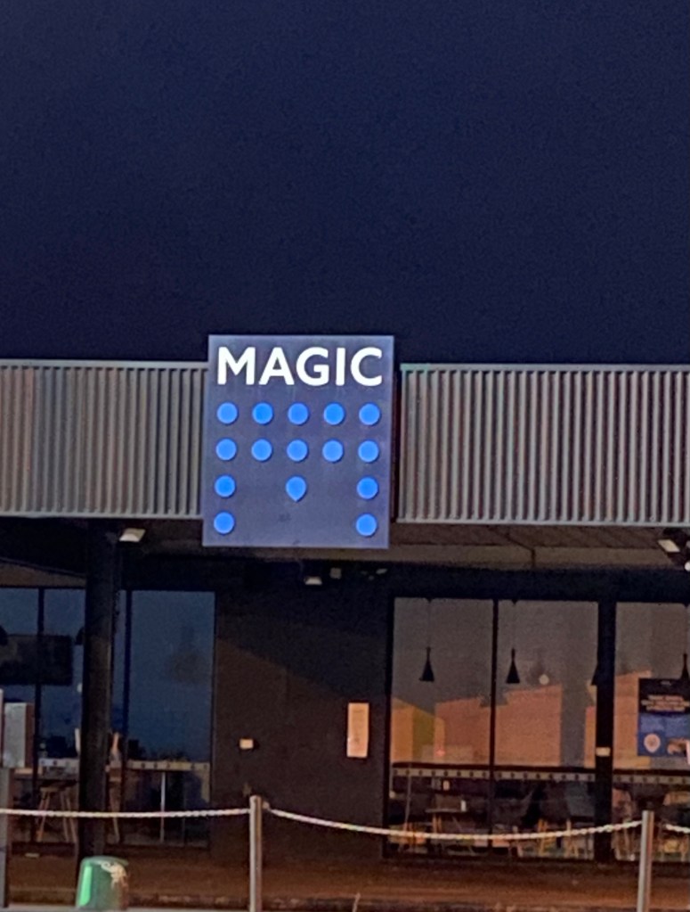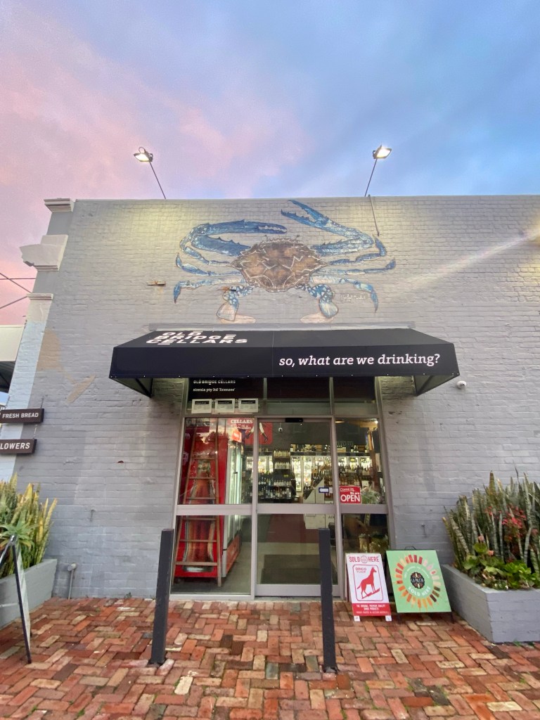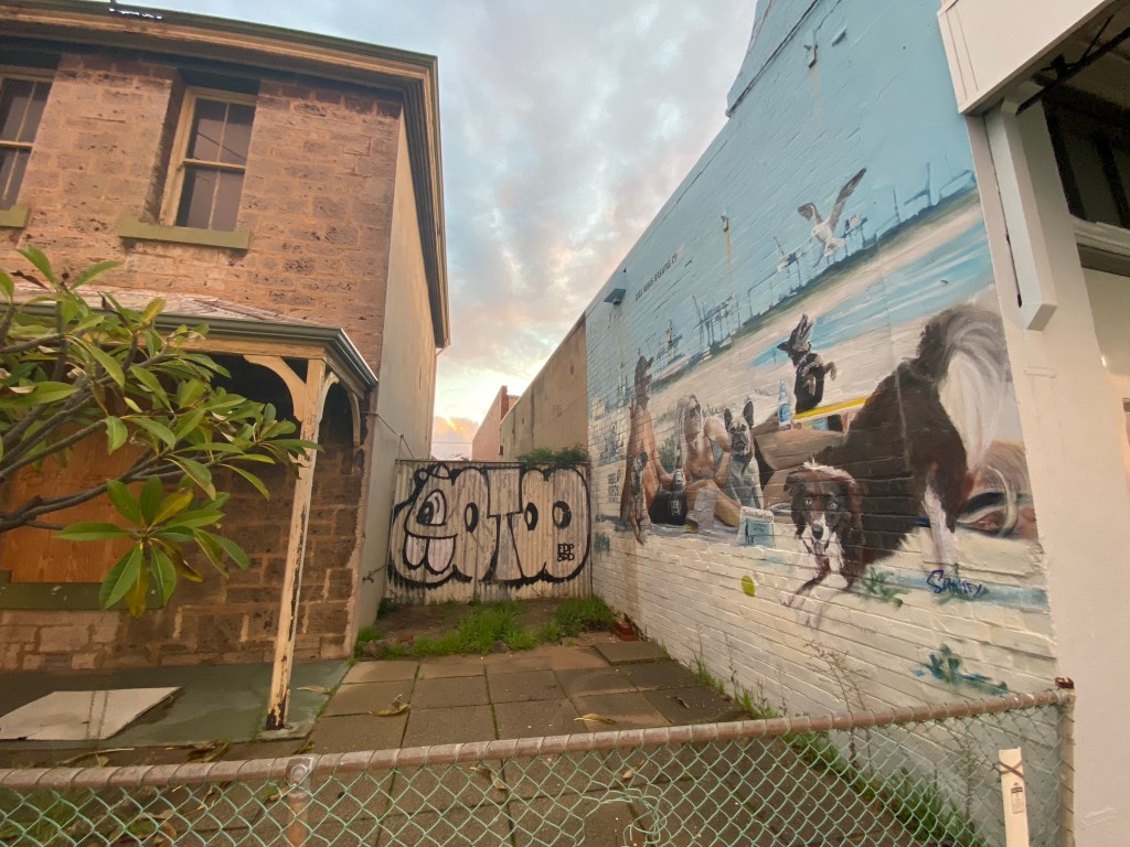 I walk past my favourite wine store with its fish mural and the crab above the door. On the other wall, next to Mojos music bar, is a larger wall painting of happy dogs on the beach. I can’t make out the bold swirled letters in the gap before the post office.