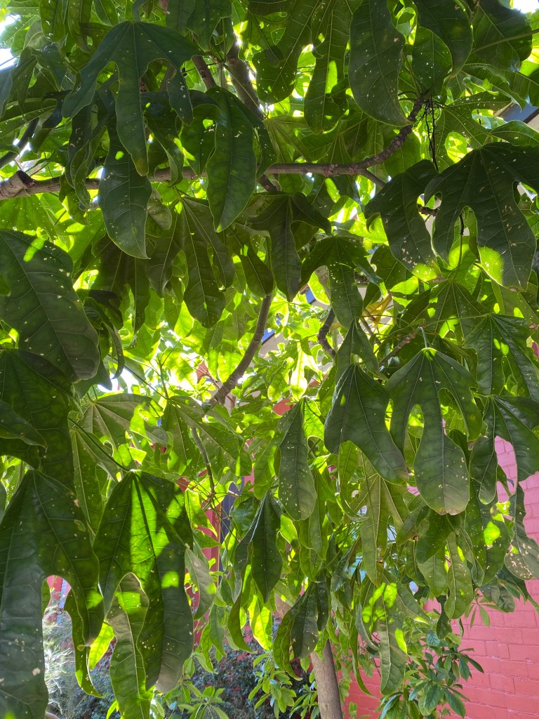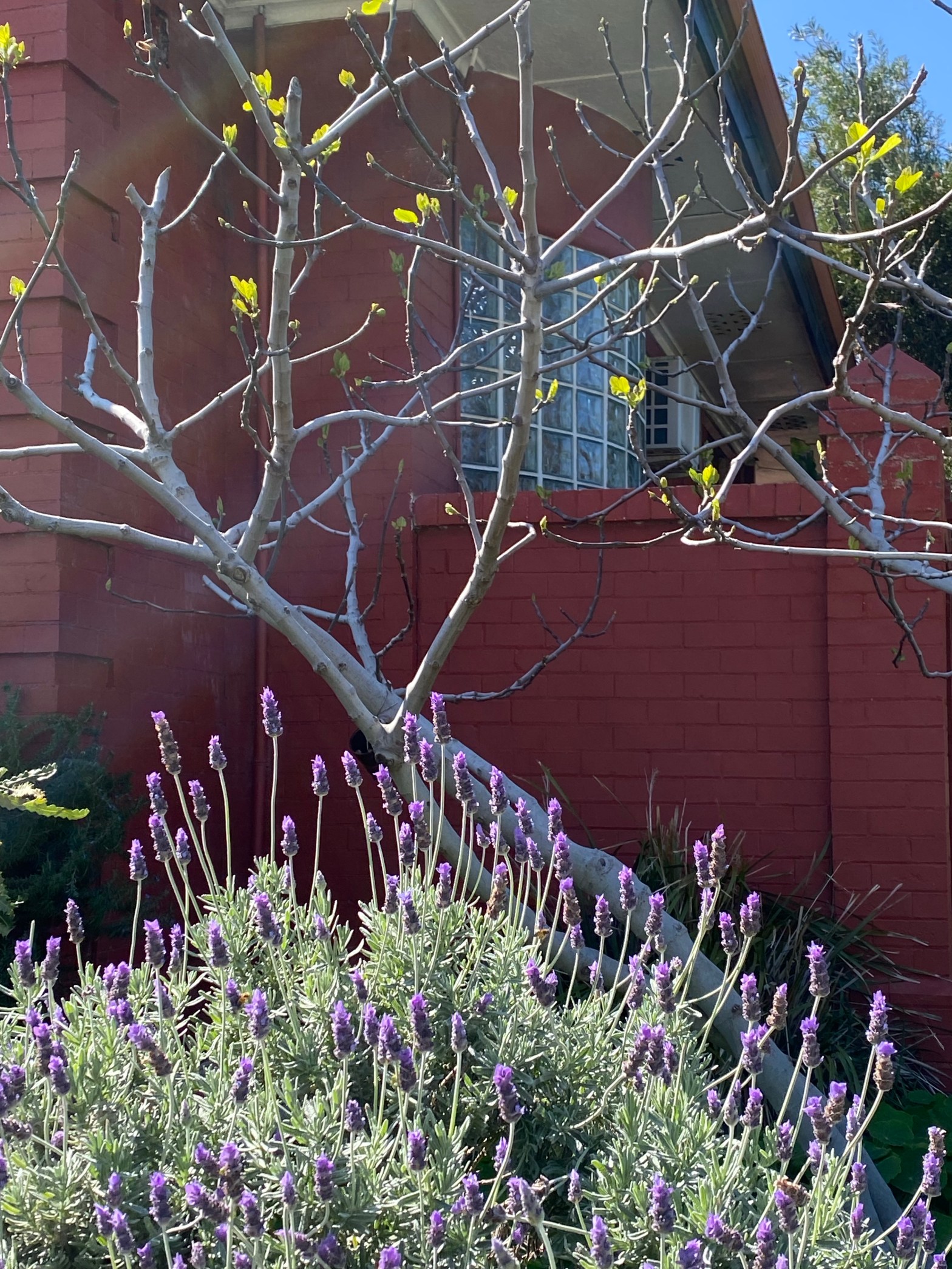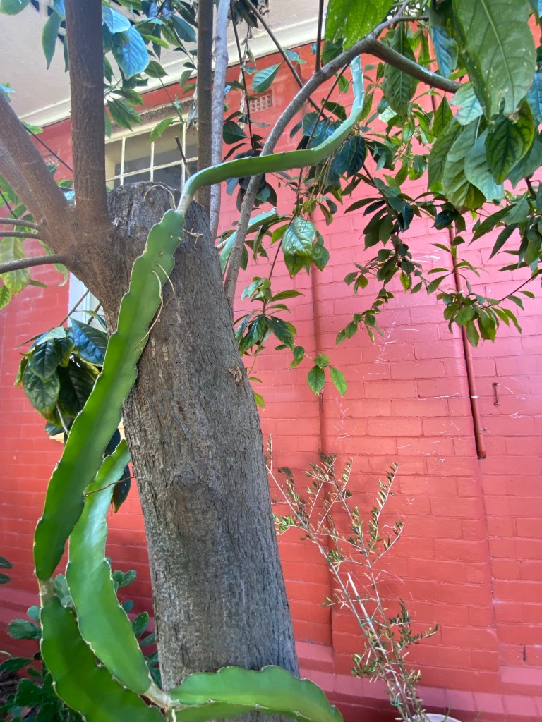 I have been watching the olive tree for weeks and yesterday morning it seemed like the leaves have budded overnight. The morning sun was streaming through its still naked branches and pushing its way through the tree canopies in the front garden.The cactus leaning against a tree trunk has reached the lower branches.