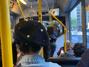 Behind me is a conversation in German, in front a group of young women conversing merrily in Spanish, hands moving and laughter.This bus is filled with a variety of languages, accents and looks: the girl in the beret sprinkled with chunky pearls, thick black plaits poking out from underneath, the man further down the aisle, tattooed and hooded, the very English older couple sitting opposite. All sorts of looks. Spanish/ Iranian //Chinese ? Australian ? It’s late afternoon so plenty of business suits and office wear as well .