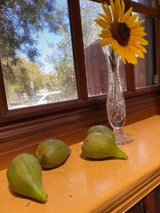The tree has its own mind and I can chop and water and care or not care, but it spreads where it will and grows fruit regardless. The figs I picked before the birds are not ripe. So they’re on the window sill to ripen, hopefully.