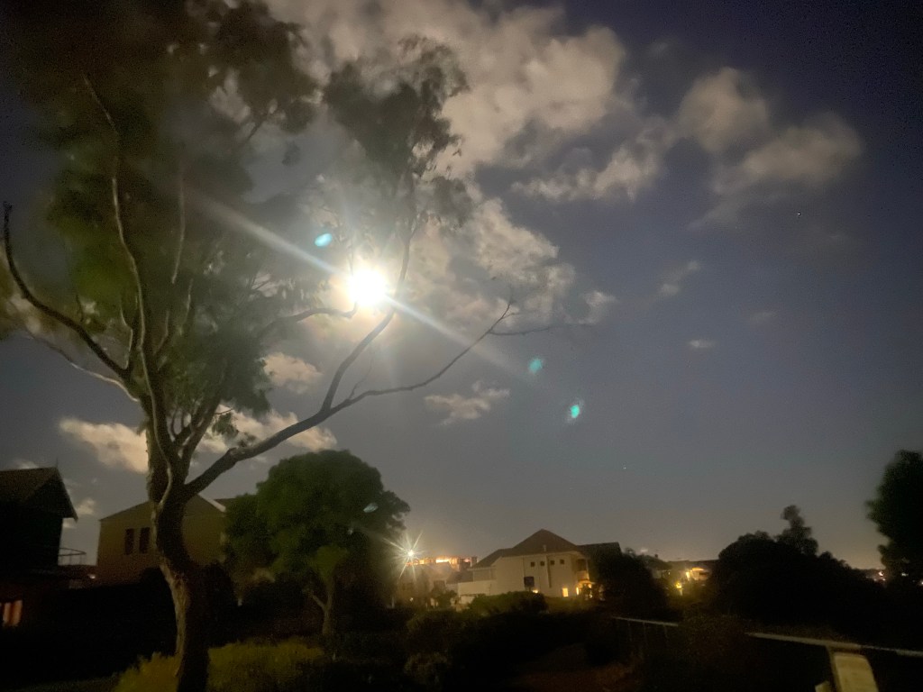 I turn around at the Moreton Bay fig tree, opposite Clancy’s Fish pub at the entry to Fremantle. No time to stop for a beer. The way back is unexpectedly bright as there is a full moon tonight:I move from Saint Patrick’s Basilica towards the old bridge. A glimpse of Cantonment Hill, a long look at the Navy Store with the octopus reaching its tentacles across the peeling paint. The backdrop of bright moon and swirling cloud creates a Tolkien -like space, mysterious and other worldly.