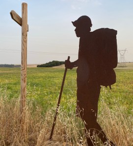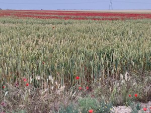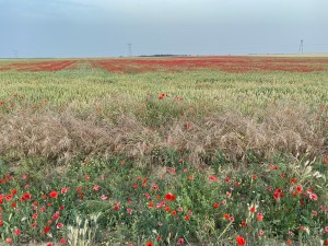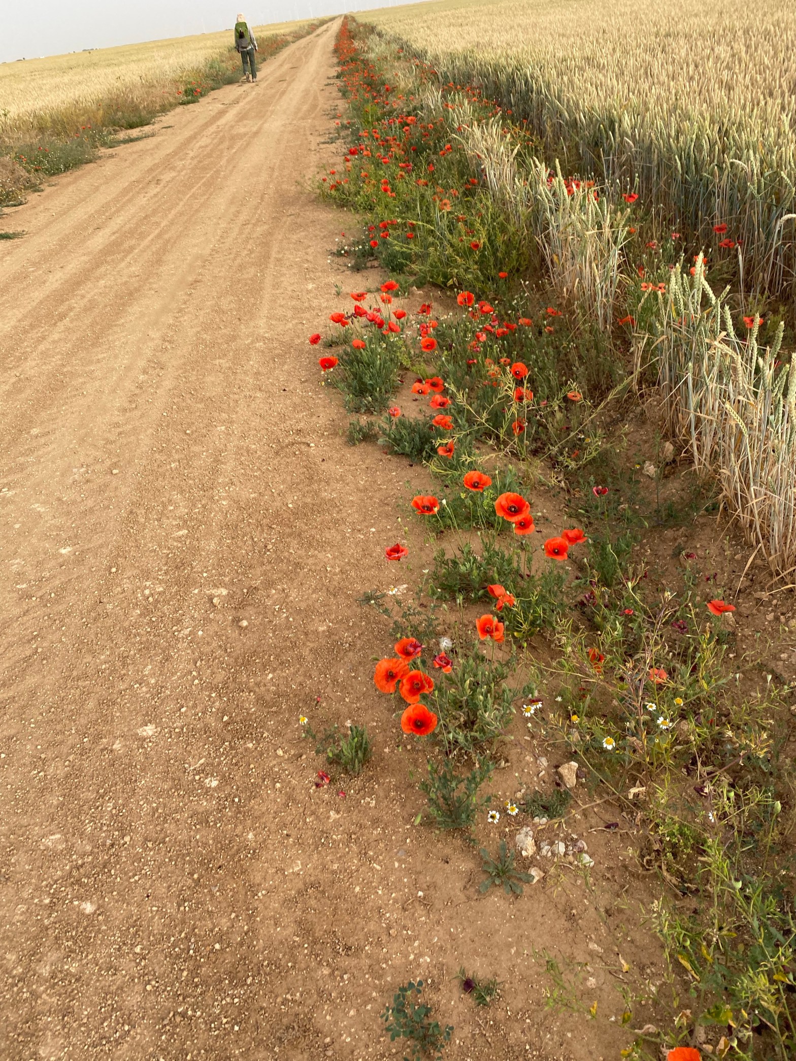 Well as proper peregrinos we should be walking every single day, each etapa( stage). In June in central Spain on this Camino Madrid this means slogging along for 20/24 km each day. Slogging along paths that are “ preciosa” in early summer but are now straight, sandy, treeless ways. The landscape, which seems to stretch on forever, is brown corn or grass with the occasional red poppy and groups of upright yellow plants.