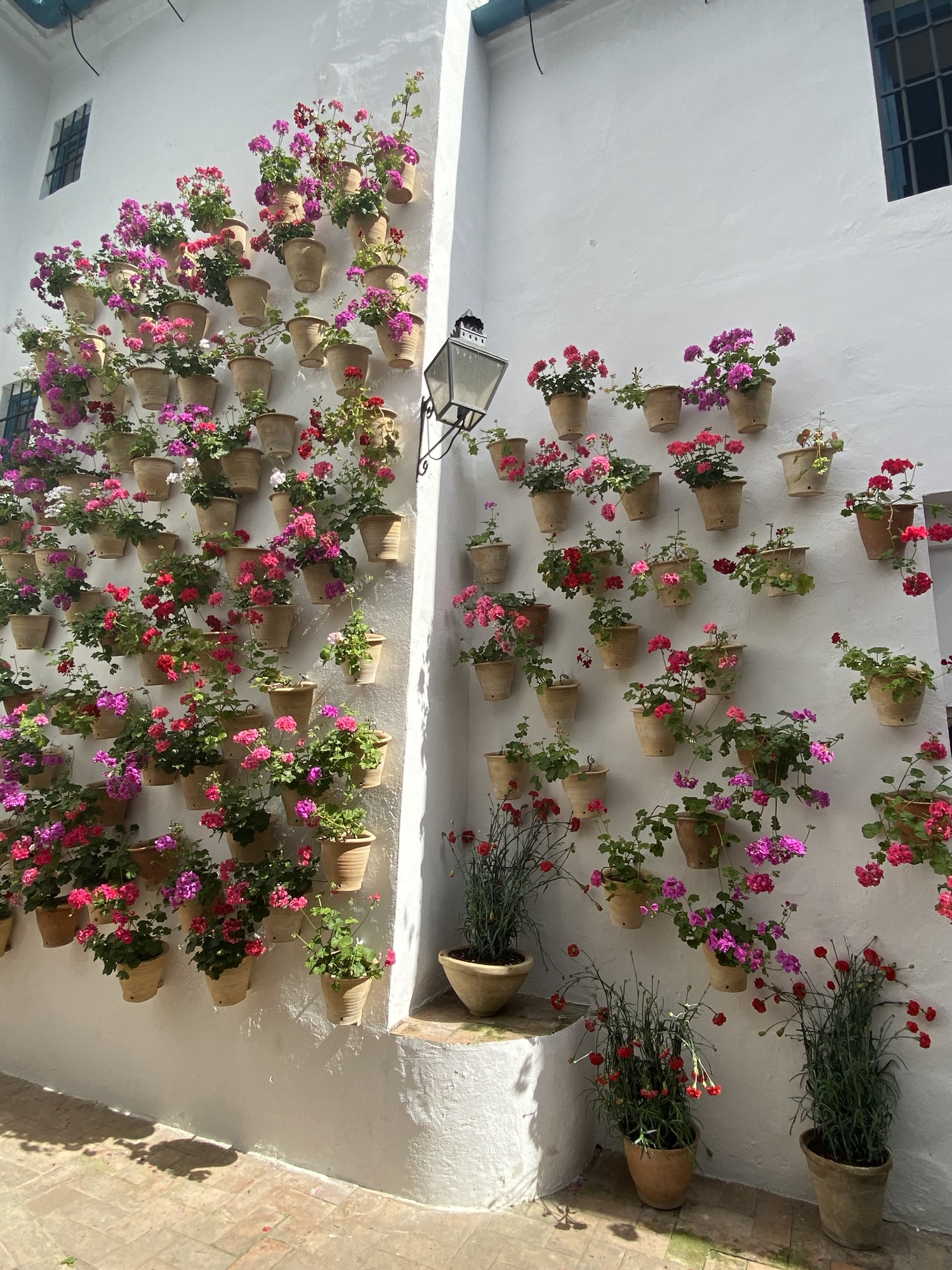 Previous Image Next Image Whole wall covered in pots of geraniums Whole wall covered in pots of geraniums